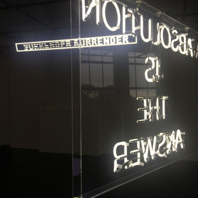Tot slot mogen de lichtsculpturen van Elise Sothys (1989) niet onvermeld blijven. Ze zijn hypnotisch en bedwelmend (een monitor met de snelheid van een stroboscoop aan en uit flitsende woorden believe now– of andersom natuurlijk), en zouden letterlijk oogverblindend moeten zijn ware het niet dat haar werk teveel daglicht mee krijgt in een halletje van het GEM. Sothys’ werk hoort in het pikdonker, het liefst op een protestantse rave (Absolution is the Answer).