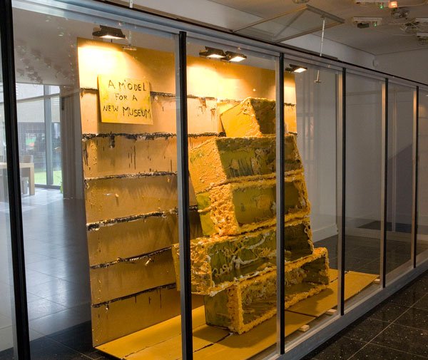 In zijn conceptuele werk speelt Bokma (1980) op ironische wijze met het al dan niet beperkende gegeven van de museale context, maar nu hij exposeert in het GEM is er sprake van een dubbele bodem van ironie. Vooral ook omdat zijn self-styled musea in twee kassen van glas zijn geplaatst. Met zijn Museum of Art presents it’s Collection of Failures en A Model for a New Museum bijt Bokma de spits af van een nieuwe programmering in het Museum voor Actuele Kunst. De twee kassen, een overblijfsel van de manifestatie Dutch Masters, in de foyer van het GEM worden de microkosmos voor jonge, beginnende alsmede gerenommeerde kunstenaars om te experimenteren met deze verrassende ruimtes. Jan Bokma zet ze onmiddellijk naar eigen hand. Hij is daarbij naast kunstenaar en curator tevens criticus als hij in zijn Museum of Art een collectie mislukkingen presenteert. Mislukking? Zijn ironische visie op het o zo traditionele bronzen beeldhouwwerk van een paard, waarbij hij het edelmetaal vervangen heeft door materiaal dat lijkt op smeerkaas, is echter prima gelukt. Bokma werkt met purschuim, een materiaal dat in de bouw toegepast wordt voor het dichten van gaten en kieren. Hij gebruikt dit spul, dat oogt als gestolde blubber, om grillige vormen en schijnbare abstracties te maken die hij vervolgens van verschillende tinten geel voorziet en afzet tegen grove houten platen waar okergele verf op gekliederd is. Bij zijn werk staat meestal een slordig geschreven houten bordje met de titel van het werk, een referentie naar de keurige kaartjes die in musea naast de schilderijen hangen. Bokma gaat een stapje verder met het geven van droge, brave info. Op het bordje bij A Model for a New Museum, overigens een schots en scheef bouwsel van aan elkaar gekoekte bloembakken vol frutsels, staat onder zijn naam het niet mis te verstane ‘visionair’ gekalkt. Ten overvloede, zullen we maar denken.