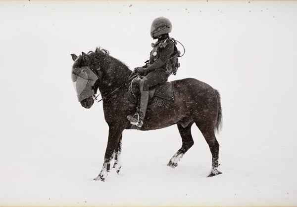 In een andere ruimte van West vermengt het geratel van een filmprojector zich met haperende stukjes pianomuziek en een onheilspellend geruis. Aangezien het visuele een sterkere aantrekkingskracht heeft op het brein dan het auditieve staan we gebiologeerd te staren naar een bewegend beeld op een scherm. Er is een ruiter te paard in een sneeuwlandschap. Mens en dier lijken de weg kwijt in een volledig wit landschap. Horizon en aarde vormen een geheel in deze white-out condition. De zwarte ruiter en zijn even donkere paard trekken voortdurend op in onbestemde richtingen om uiteindelijk niet meer dan een cirkel te markeren. De beelden zijn zwart-wit, de kwaliteit is grofkorrelig. De film suggereert een flard uit een grijs verleden te zijn. De helmen die ruiter en paard moeten beschermen tegen de niet aflatende sneeuwval, maar blijkbaar niet tegen sneeuwblindheid, zien er echter eigentijds of zelfs, zoals in het geval van de helm van het paard, futuristisch uit. De zwarte ruiter lijkt een tijdreiziger, verstrikt in een voor hem vreemd en vijandig gebied. De soundtrack voor deze barre tocht, die tot een stilstand lijkt te komen, een in de tijd bevroren moment, is hypnotiserend maar verwarrend door de voortdurende onderbrekingen van het pianospel – alsof er een plaat overslaat of blijft hangen in de groef. Achter het filmscherm staan acht draaitafels met zeven grammofoonplaten van Glenn Goulds befaamde uitvoering van de Goldberg Variaties van J.S. Bach. Het vinyl is geprepareerd en slechts enkele tonen zijn hoorbaar in een gemankeerde cadans die helaas iets te geforceerd met ons besef van tijd speelt. De achtste plaat is gemaakt door de Canadese componist Guilaume-van Roberge en bevat gesuis en geruis dat de sfeer van de sneeuwstorm versterkt en daarmee het gesuggereerde narratief op dramatische wijze stuurt en manipuleert.