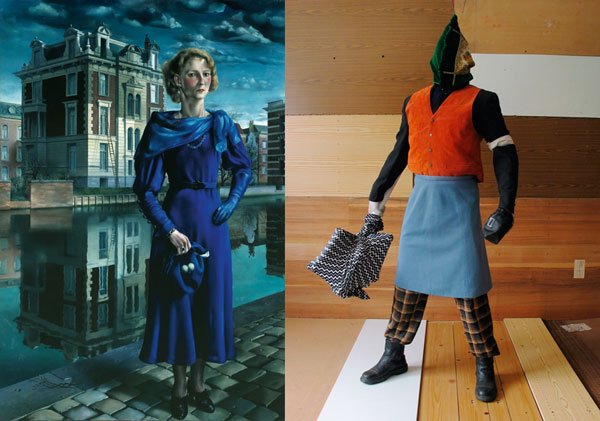 Typerend voor Willinks magisch realisme, waarbij hij zich liet inspireren door Renaissancearchitectuur en de Italiaanse schilder De Chirico, is de beklemmende, droomachtige sfeer in zijn hyperrealistische landschappen, met dreigende wolken als symbool voor de onrustige psyche. In de intrigerende zaalindeling van de giga-expositie XXste eeuw, de afscheidstentoonstelling van Wim van Krimpen, hangt Wilma lijnrecht tegenover Rain McKeul van Thorsten Brinkmann. Ja, dat is even schrikken. Het lijkt wel een vogelverschrikker, gehuld in een overdaad aan afgedankte kleding uit ons consumentenparadijs. De Duitser Brinkmann (1971) heeft in korte tijd naam gemaakt met readymades, gevonden objecten die hij niet zelden gebruikt voor zelfportretten. Rain McKeul is zo’n foto waarop Brinkmann in een ironisch heldhaftige houding poseert als de kroniekschrijver van de wegwerpmaatschappij. Even verderop in het Gemeentemuseum staat De Golem, een sculptuur bestaande uit stukken roestig metaal, oude kettingen en de onderkaak van een zwijn. De verbinding tussen de Zwitser Jean Tinguely (1925 –1991), een vertegenwoordiger van de Nieuwe Realisten, en Brinkmann is snel gelegd, terwijl een mogelijke relatie tussen Brinkmann en Willink te denken geeft. Want hoewel de tentoonstelling XXste eeuw tamelijk chronologisch is ingedeeld, worden door verrassende juxtaposities van stromingen en stijlen contrasten en vergelijkingen gemaakt.